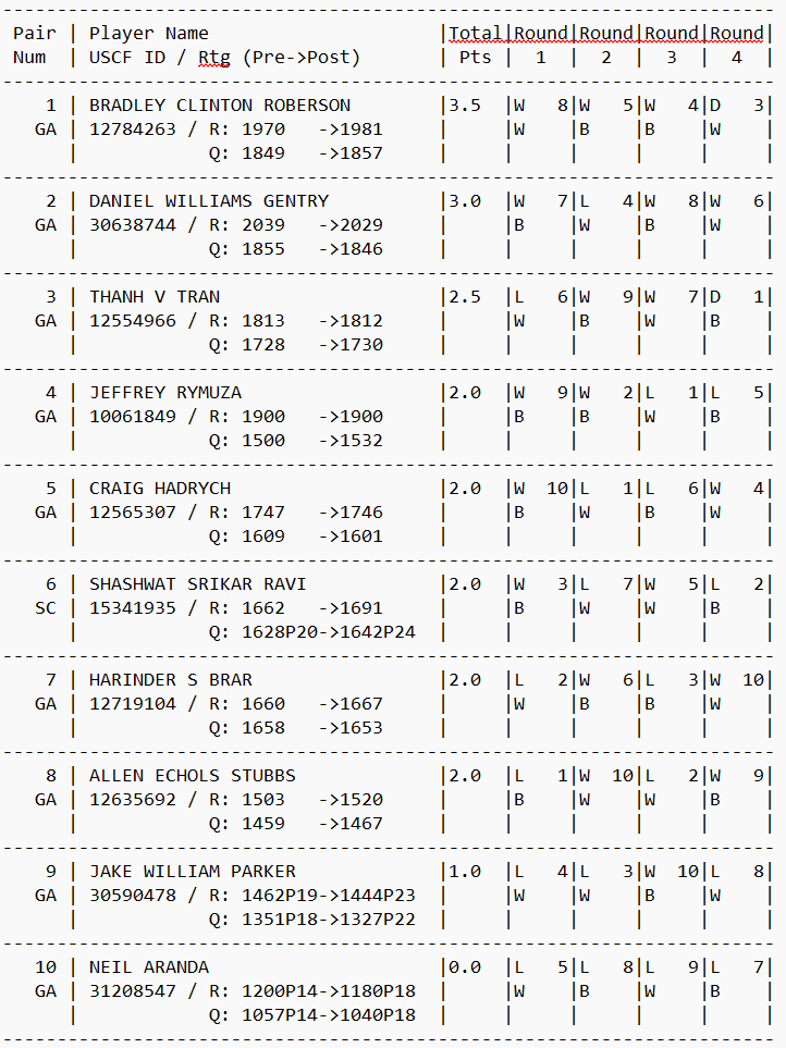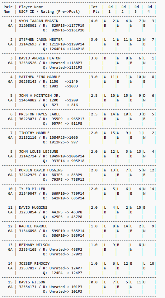 Middle Georgia Chess Club will host the Milledgeville Fall Challenge chess tournament Saturday, November 22nd, 2025, 9am – 4pm EVENT OVERVIEW Five rounds, Swiss system, USCF rated. Two sections: Open (1400+): Open to USCF rated 1400+. Reserve (U1400): Open to USCF rated under 1400 and Unrated. Sections will be assigned based
